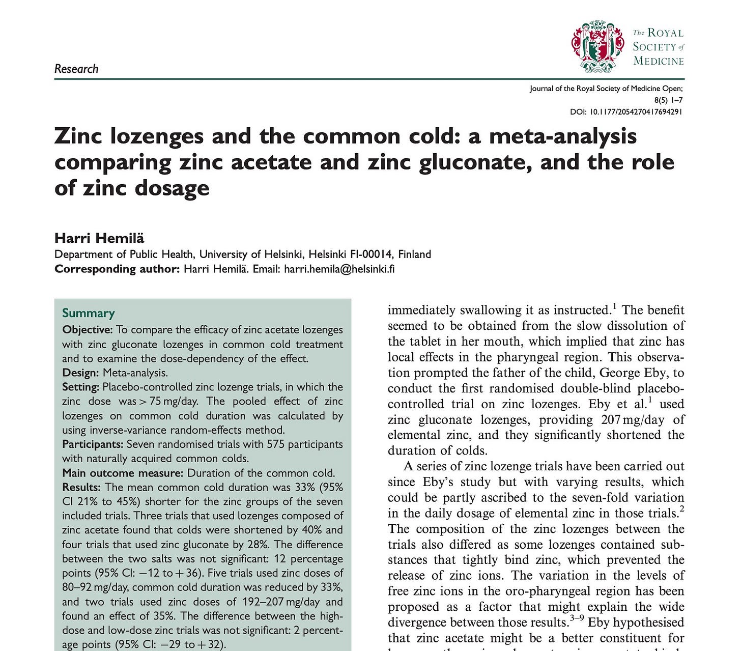 Related to my last post on being sick and how my metrics prepped me to know I might be coming down with something. I came across a pretty interesting Cochrane-backed NIH study on zinc and colds recently (the kind that actually pulls together a lot of randomized trials) shared with me by a Stanford PHD friend (Thanks Paul)!